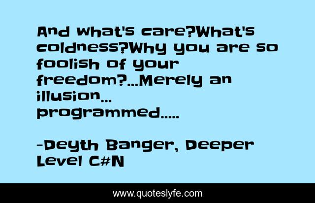 This page presents the quote "And what's care?What's coldness?Why you are so foolish of your freedom?...Merely an illusion... programmed.....". Author of this quote is Deyth Banger, Deeper Level C#N. This quote is about merely, programmed, illusion,.
