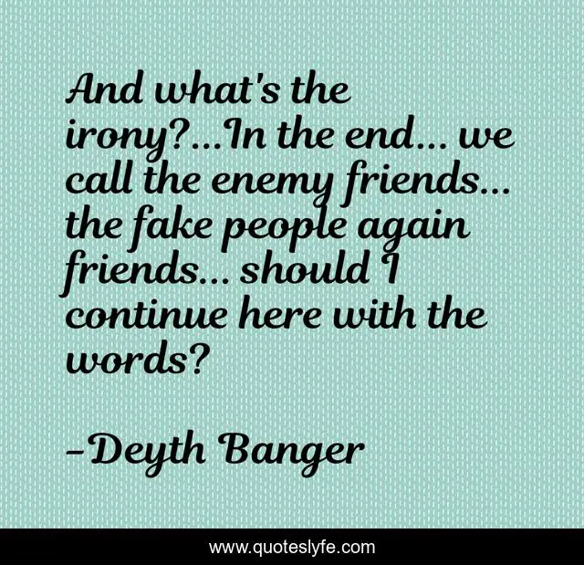 This page presents the quote "And what's the irony?...In the end... we call the enemy friends... the fake people again friends... should I continue here with the words?". Author of this quote is Deyth Banger. This quote is about enemy, end, continue, words, fake, friends,.
