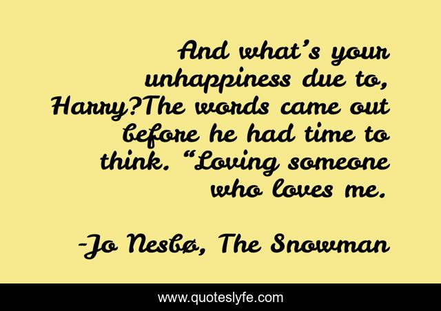This page presents the quote "And what’s your unhappiness due to, Harry?The words came out before he had time to think. “Loving someone who loves me.". Author of this quote is Jo Nesbø, The Snowman. This quote is about love, happiness, affection, unhappiness,.