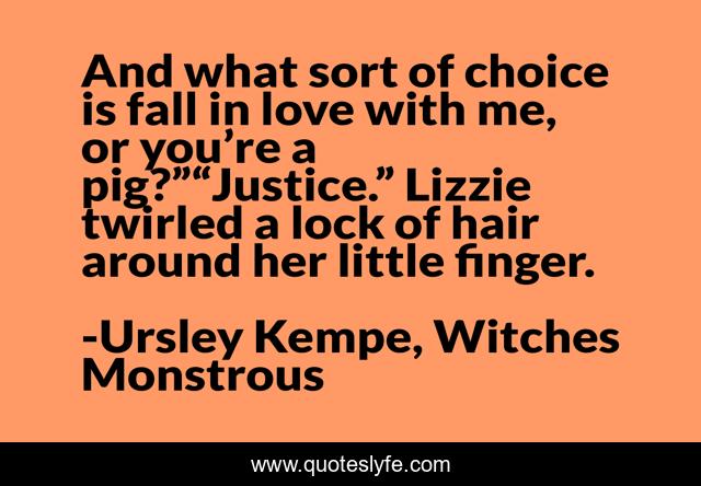 This page presents the quote "And what sort of choice is fall in love with me, or you’re a pig?”“Justice.” Lizzie twirled a lock of hair around her little finger.". Author of this quote is Ursley Kempe, Witches Monstrous. This quote is about justice, revenge, slighted,.