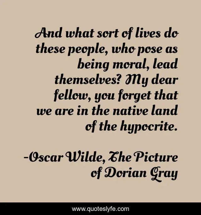 This page presents the quote "And what sort of lives do these people, who pose as being moral, lead themselves? My dear fellow, you forget that we are in the native land of the hypocrite.". Author of this quote is Oscar Wilde, The Picture of Dorian Gray. This quote is about moral, hypocrisy,.