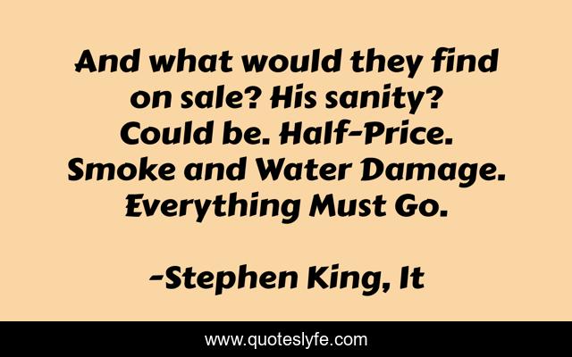 This page presents the quote "And what would they find on sale? His sanity? Could be. Half-Price. Smoke and Water Damage. Everything Must Go.". Author of this quote is Stephen King, It. This quote is about sanity, madness, sale, insanity,.