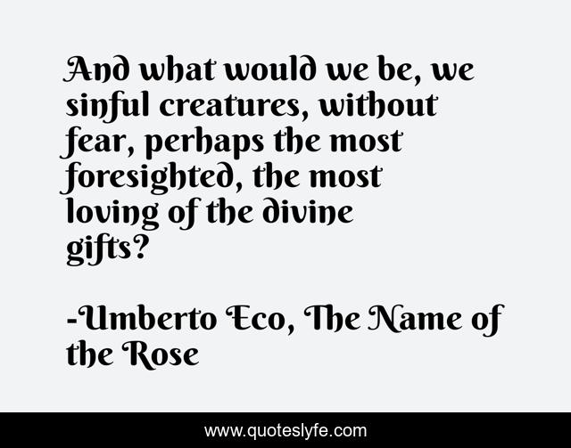 This page presents the quote "And what would we be, we sinful creatures, without fear, perhaps the most foresighted, the most loving of the divine gifts?". Author of this quote is Umberto Eco, The Name of the Rose. This quote is about weakness, human-frailty, humanity, fear, divine-revelation, sin,.