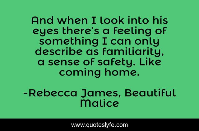 This page presents the quote "And when I look into his eyes there’s a feeling of something I can only describe as familiarity, a sense of safety. Like coming home.". Author of this quote is Rebecca James, Beautiful Malice. This quote is about home, love, affection,.