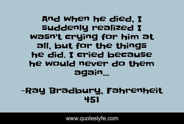 This page presents the quote "And when he died, I suddenly realized I wasn't crying for him at all, but for the things he did. I cried because he would never do them again...". Author of this quote is Ray Bradbury, Fahrenheit 451. This quote is about family-relationships, death,.