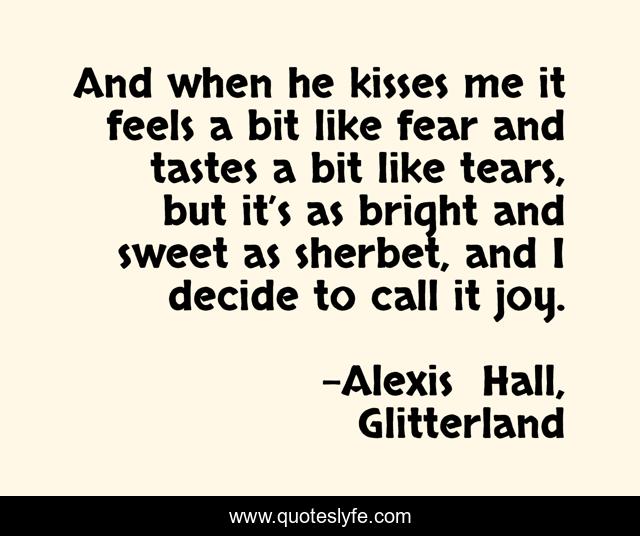 This page presents the quote "And when he kisses me it feels a bit like fear and tastes a bit like tears, but it’s as bright and sweet as sherbet, and I decide to call it joy.". Author of this quote is Alexis Hall, Glitterland. This quote is about glitterland, love, kiss, affection,.