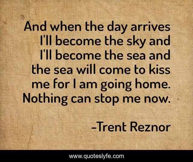 This page presents the quote "And when the day arrives I'll become the sky and I'll become the sea and the sea will come to kiss me for I am going home. Nothing can stop me now.". Author of this quote is Trent Reznor. This quote is about sky, day, sea,.