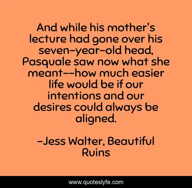 This page presents the quote "And while his mother's lecture had gone over his seven-year-old head, Pasquale saw now what she meant--how much easier life would be if our intentions and our desires could always be aligned.". Author of this quote is Jess Walter, Beautiful Ruins. This quote is about intentions, alignment, desires, life-lessons,.