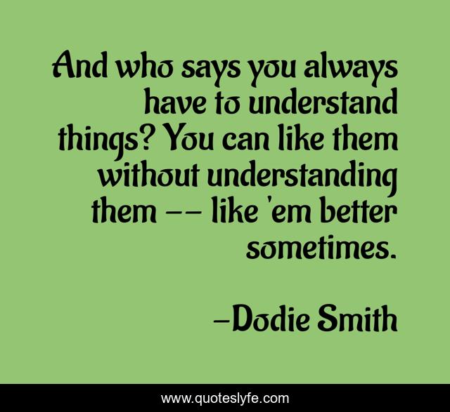 This page presents the quote "And who says you always have to understand things? You can like them without understanding them -- like 'em better sometimes.". Author of this quote is Dodie Smith. .