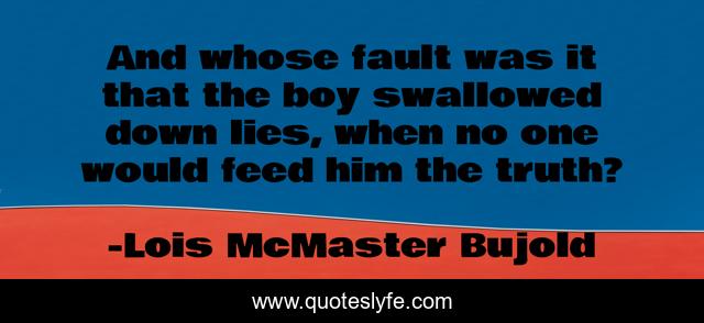 This page presents the quote "And whose fault was it that the boy swallowed down lies, when no one would feed him the truth?". Author of this quote is Lois McMaster Bujold. This quote is about lies, children, truth-telling, parenting,.