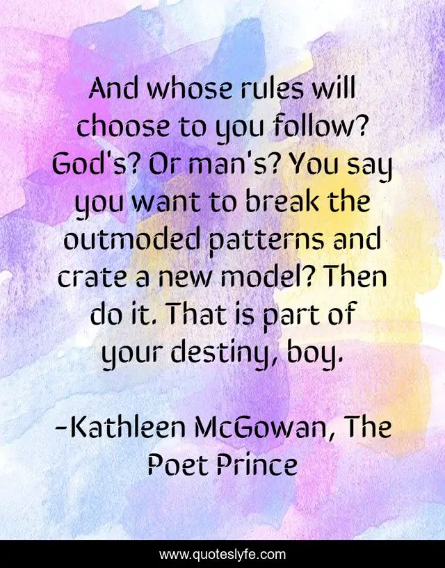 This page presents the quote "And whose rules will choose to you follow? God's? Or man's? You say you want to break the outmoded patterns and crate a new model? Then do it. That is part of your destiny, boy.". Author of this quote is Kathleen McGowan, The Poet Prince. This quote is about faith, fiction,.