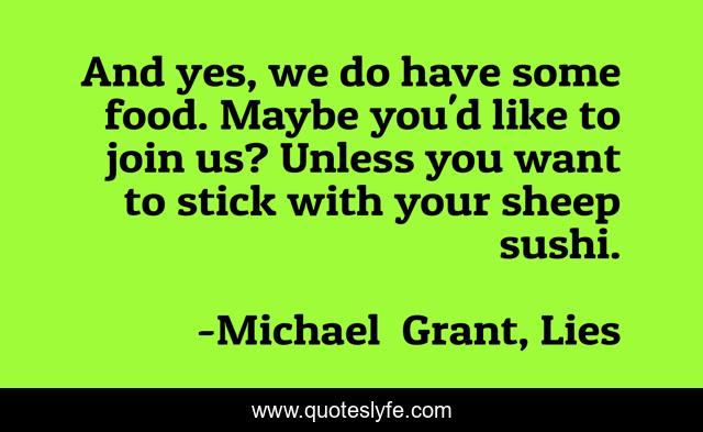 This page presents the quote "And yes, we do have some food. Maybe you'd like to join us? Unless you want to stick with your sheep sushi.". Author of this quote is Michael Grant, Lies. This quote is about michael-grant, lies, food, survival, sushi, gone-series, sanjit,.