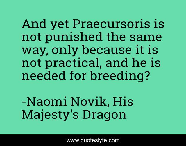 This page presents the quote "And yet Praecursoris is not punished the same way, only because it is not practical, and he is needed for breeding?". Author of this quote is Naomi Novik, His Majesty's Dragon. This quote is about irony, injustice, logic,.