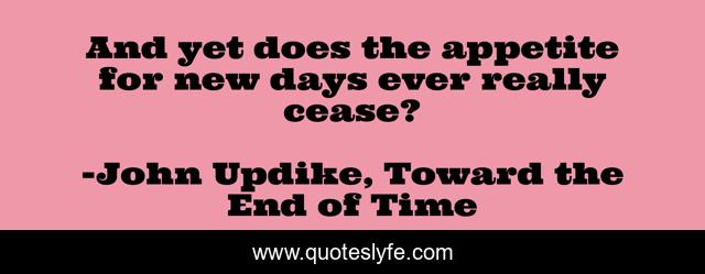This page presents the quote "And yet does the appetite for new days ever really cease?". Author of this quote is John Updike, Toward the End of Time. This quote is about life-philosophy, philosophy, curiosity, identity, science,.