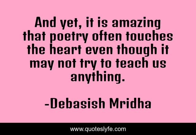 This page presents the quote "And yet, it is amazing that poetry often touches the heart even though it may not try to teach us anything.". Author of this quote is Debasish Mridha. This quote is about what-is-poetry, philosophy, debasish-mridha, poetry, poetry-touches-the-heart, quotes, debasish-mridha-md, inspirational, enthusiasm,.