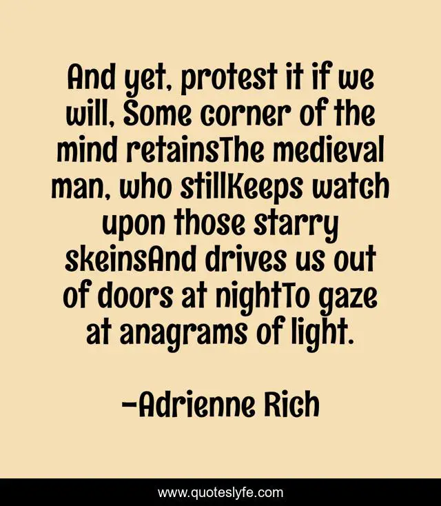 This page presents the quote "And yet, protest it if we will, Some corner of the mind retainsThe medieval man, who stillKeeps watch upon those starry skeinsAnd drives us out of doors at nightTo gaze at anagrams of light.". Author of this quote is Adrienne Rich. This quote is about mind, significance,.