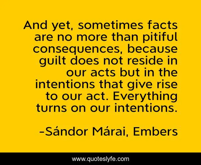 This page presents the quote "And yet, sometimes facts are no more than pitiful consequences, because guilt does not reside in our acts but in the intentions that give rise to our act. Everything turns on our intentions.". Author of this quote is Sándor Márai, Embers. This quote is about consequence, guilt, intent, truth,.