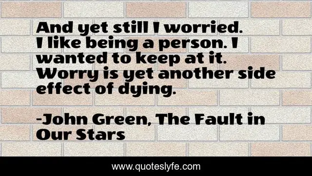 This page presents the quote "And yet still I worried. I like being a person. I wanted to keep at it. Worry is yet another side effect of dying.". Author of this quote is John Green, The Fault in Our Stars. This quote is about side-effects, the-fault-in-our-stars, john-green, worry,.