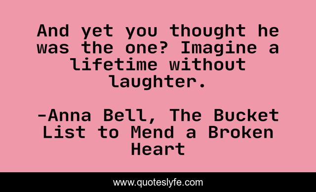 This page presents the quote "And yet you thought he was the one? Imagine a lifetime without laughter.". Author of this quote is Anna Bell, The Bucket List to Mend a Broken Heart. This quote is about broken-heart, break-up, love, bucket-list, affection,.