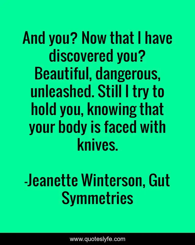 This page presents the quote "And you? Now that I have discovered you? Beautiful, dangerous, unleashed. Still I try to hold you, knowing that your body is faced with knives.". Author of this quote is Jeanette Winterson, Gut Symmetries. This quote is about relationships, love, affection,.