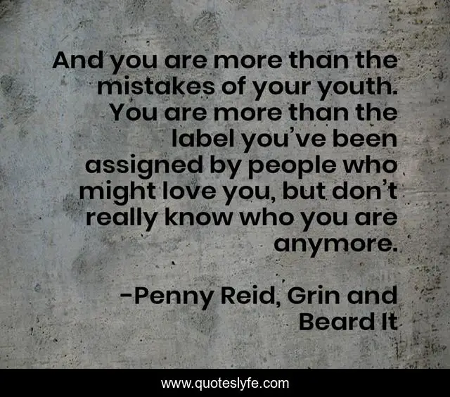 This page presents the quote "And you are more than the mistakes of your youth. You are more than the label you’ve been assigned by people who might love you, but don’t really know who you are anymore.". Author of this quote is Penny Reid, Grin and Beard It. This quote is about youth, think-outside-the-box, labels, inspirational, enthusiasm,.