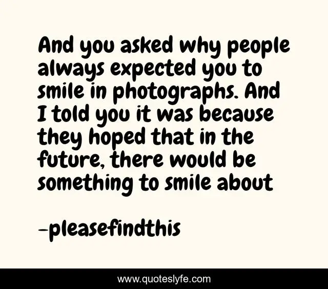 This page presents the quote "And you asked why people always expected you to smile in photographs. And I told you it was because they hoped that in the future, there would be something to smile about". Author of this quote is pleasefindthis. This quote is about photographs, smile, happiness,.