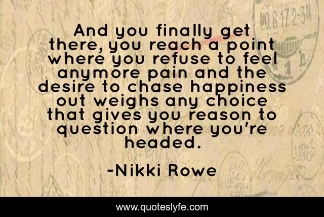 This page presents the quote "And you finally get there, you reach a point where you refuse to feel anymore pain and the desire to chase happiness out weighs any choice that gives you reason to question where you're headed.". Author of this quote is Nikki Rowe. This quote is about life, life-lessons, be-yourself, guidance, wild-and-free, understanding, know-yourself, quotes, awakening,.