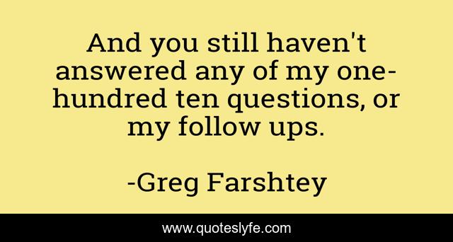 This page presents the quote "And you still haven't answered any of my one-hundred ten questions, or my follow ups.". Author of this quote is Greg Farshtey. This quote is about vezon, questions,.