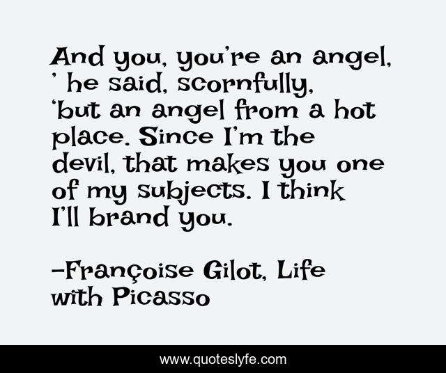 This page presents the quote "And you, you’re an angel, ’ he said, scornfully, ‘but an angel from a hot place. Since I’m the devil, that makes you one of my subjects. I think I’ll brand you.". Author of this quote is Françoise Gilot, Life with Picasso. This quote is about devil, art, angel, love, picasso, affection,.