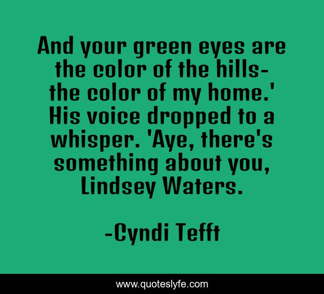 This page presents the quote "And your green eyes are the color of the hills- the color of my home.' His voice dropped to a whisper. 'Aye, there's something about you, Lindsey Waters.". Author of this quote is Cyndi Tefft. This quote is about grim-reaper, romance, kilt, ya, paranormal,.