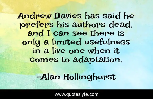 This page presents the quote "Andrew Davies has said he prefers his authors dead, and I can see there is only a limited usefulness in a live one when it comes to adaptation.". Author of this quote is Alan Hollinghurst. This quote is about adaptations, authors,.