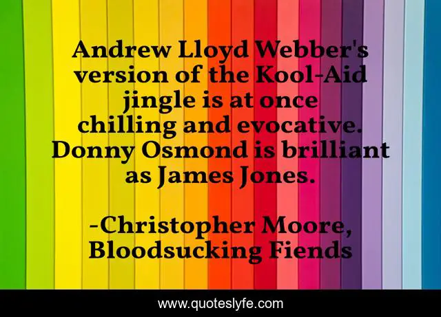This page presents the quote "Andrew Lloyd Webber's version of the Kool-Aid jingle is at once chilling and evocative. Donny Osmond is brilliant as James Jones.". Author of this quote is Christopher Moore, Bloodsucking Fiends. This quote is about series, humor, vampires, fiction,.