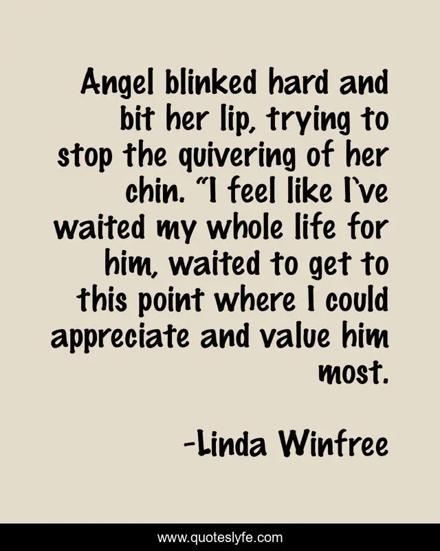 This page presents the quote "Angel blinked hard and bit her lip, trying to stop the quivering of her chin. “I feel like I’ve waited my whole life for him, waited to get to this point where I could appreciate and value him most.". Author of this quote is Linda Winfree. This quote is about romance, love, affection, romance-novels,.