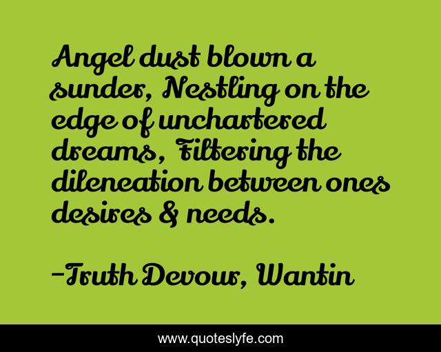 This page presents the quote "Angel dust blown a sunder, Nestling on the edge of unchartered dreams, Filtering the dileneation between ones desires & needs.". Author of this quote is Truth Devour, Wantin. This quote is about love, desires, affection, dreaming,.