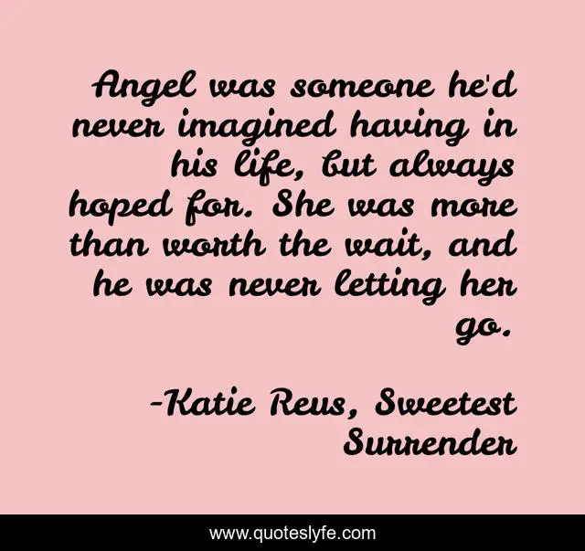 This page presents the quote "Angel was someone he'd never imagined having in his life, but always hoped for. She was more than worth the wait, and he was never letting her go.". Author of this quote is Katie Reus, Sweetest Surrender. .