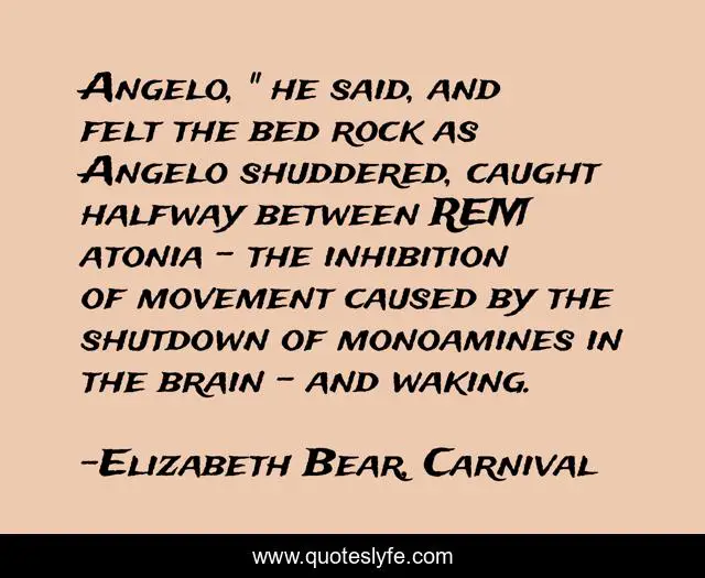 This page presents the quote "Angelo, " he said, and felt the bed rock as Angelo shuddered, caught halfway between REM atonia - the inhibition of movement caused by the shutdown of monoamines in the brain - and waking.". Author of this quote is Elizabeth Bear, Carnival. This quote is about biology, brain-chemistry, hard-sci-fi, sleep, hard-science-fiction, neuroscience,.