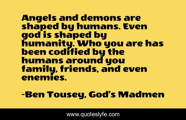 "Ben Tousey, God's Madmen Quotes." Quoteslyfe.com, 2025. Fri. 05 Dec. 2025. <https://www.quoteslyfe.com/quote/Angels-and-demons-are-shaped-by-humans-219617>.