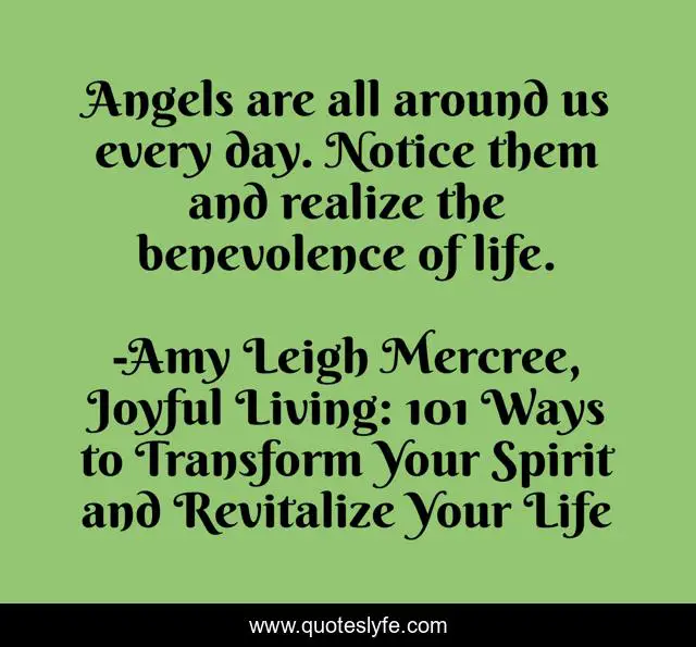This page presents the quote "Angels are all around us every day. Notice them and realize the benevolence of life.". Author of this quote is Amy Leigh Mercree, Joyful Living: 101 Ways to Transform Your Spirit and Revitalize Your Life. This quote is about quotes-about-angels, life, quotes-de-la-vida, amy-leigh-mercree, quotes-on-angels, angel, quote-of-the-day, joyful-living, angels,.