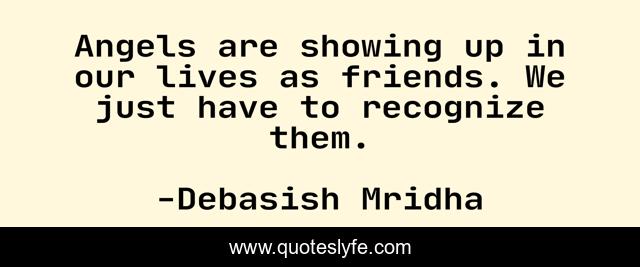 This page presents the quote "Angels are showing up in our lives as friends. We just have to recognize them.". Author of this quote is Debasish Mridha. This quote is about angel-in-our-lives, friends, philosophy, debasish-mridha, quotes, debasish-mridha-md, inspirational, enthusiasm, angels,.