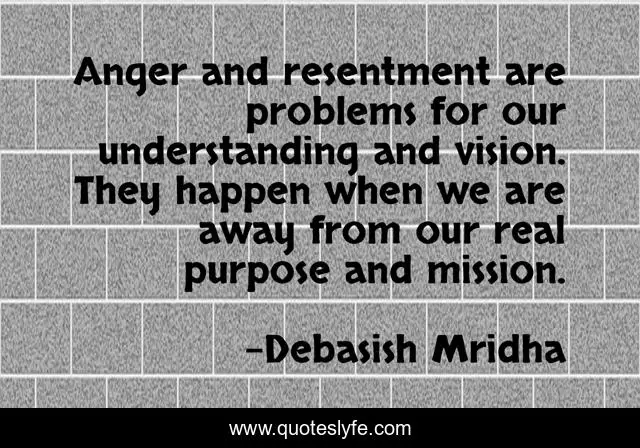 This page presents the quote "Anger and resentment are problems for our understanding and vision. They happen when we are away from our real purpose and mission.". Author of this quote is Debasish Mridha. This quote is about life, love, knowledge, inspirational, intelligence, philosophy, wisdom, quotes, affection,.