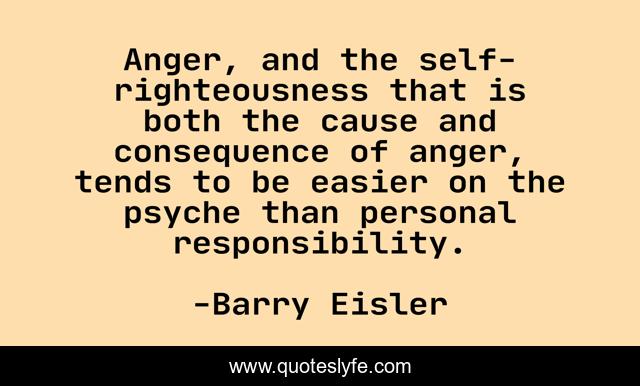 This page presents the quote "Anger, and the self-righteousness that is both the cause and consequence of anger, tends to be easier on the psyche than personal responsibility.". Author of this quote is Barry Eisler. This quote is about personal, responsibility,.