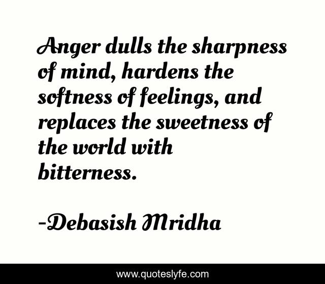 This page presents the quote "Anger dulls the sharpness of mind, hardens the softness of feelings, and replaces the sweetness of the world with bitterness.". Author of this quote is Debasish Mridha. This quote is about philosophy, debasish-mridha, quotes, sweetness-of-the-world, debasish-mridha-md, inspirational, anger, enthusiasm, effect-of-anger,.