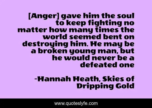 This page presents the quote "[Anger] gave him the soul to keep fighting no matter how many times the world seemed bent on destroying him. He may be a broken young man, but he would never be a defeated one". Author of this quote is Hannah Heath, Skies of Dripping Gold. This quote is about skies-of-dripping-gold, dystopian-novel, christian-fiction, christian-dystopian, short-story, anger, ya-fiction,.