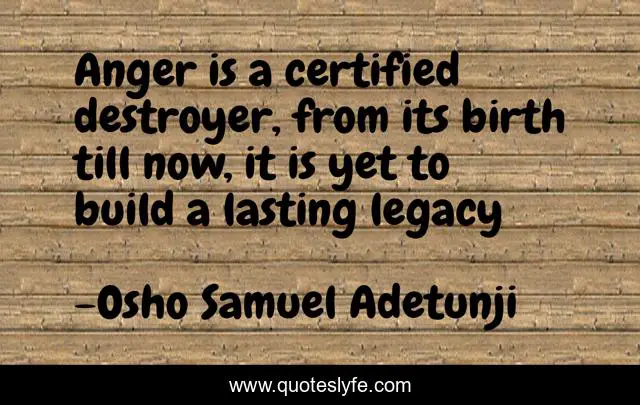 This page presents the quote "Anger is a certified destroyer, from its birth till now, it is yet to build a lasting legacy". Author of this quote is Osho Samuel Adetunji. This quote is about legacy, anger-management, greatness,.