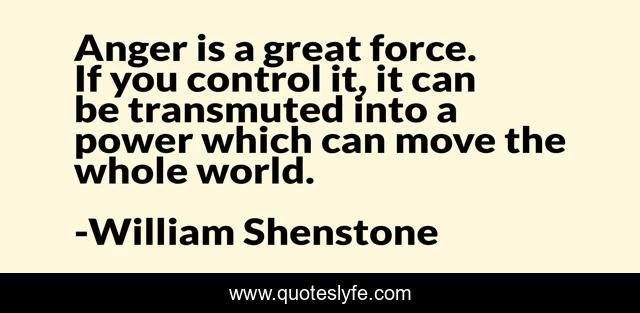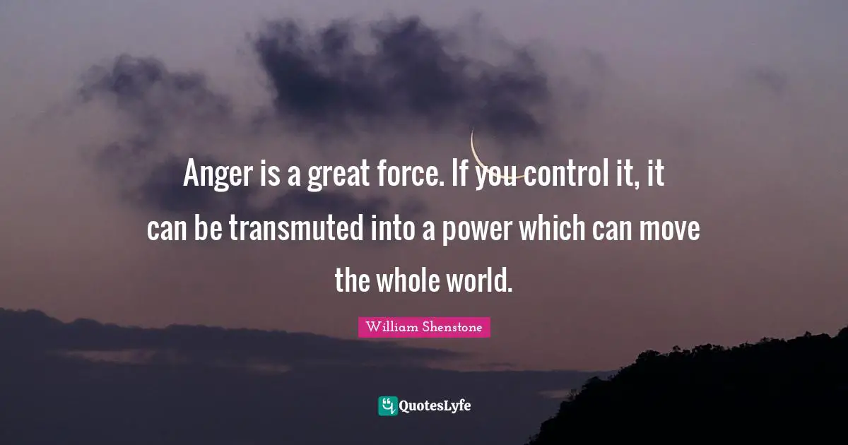 This page presents the quote "Anger is a great force. If you control it, it can be transmuted into a power which can move the whole world.". Author of this quote is William Shenstone. This quote is about anger, world, great,.