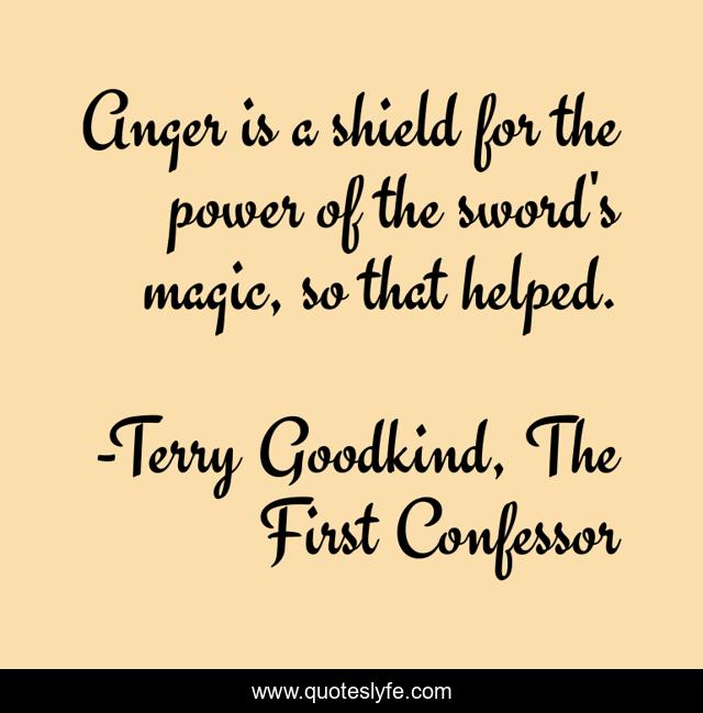 This page presents the quote "Anger is a shield for the power of the sword's magic, so that helped.". Author of this quote is Terry Goodkind, The First Confessor. This quote is about anger, magic, shield, sword,.
