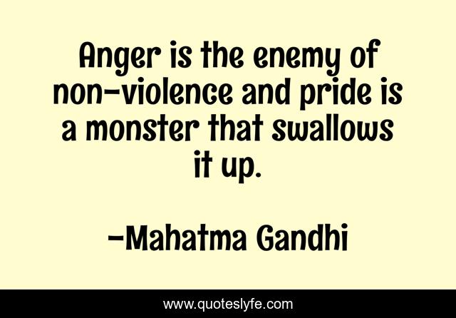This page presents the quote "Anger is the enemy of non-violence and pride is a monster that swallows it up.". Author of this quote is Mahatma Gandhi. This quote is about enemy, pride, non-violence,.