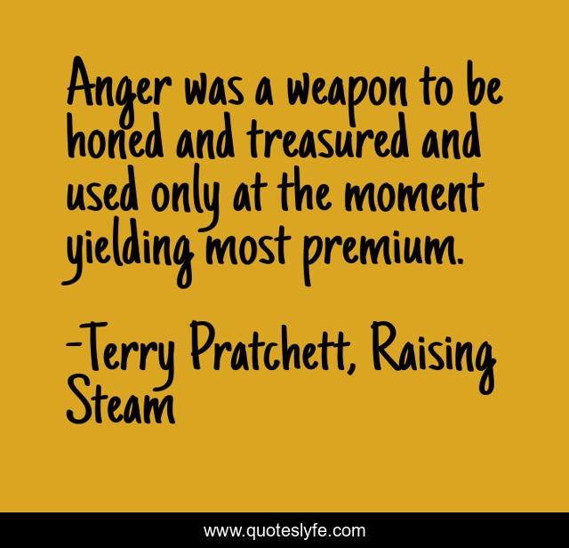 This page presents the quote "Anger was a weapon to be honed and treasured and used only at the moment yielding most premium.". Author of this quote is Terry Pratchett, Raising Steam. This quote is about anger, weapons, terry-pratchett,.