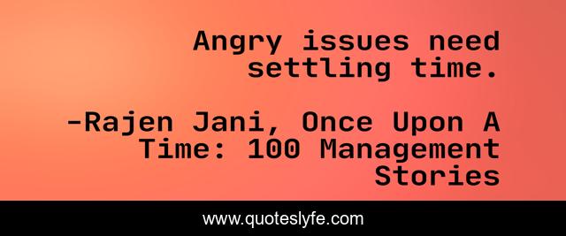 This page presents the quote "Angry issues need settling time.". Author of this quote is Rajen Jani, Once Upon A Time: 100 Management Stories. This quote is about motivation, communication, sales, anger, improvement, quality, management, knowledge, strategy,.