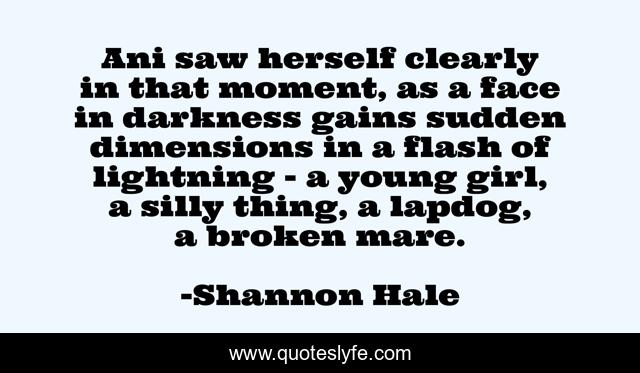 This page presents the quote "Ani saw herself clearly in that moment, as a face in darkness gains sudden dimensions in a flash of lightning - a young girl, a silly thing, a lapdog, a broken mare.". Author of this quote is Shannon Hale. This quote is about broken, self-awareness, young, young-girl,.